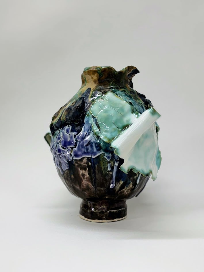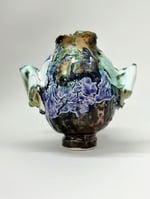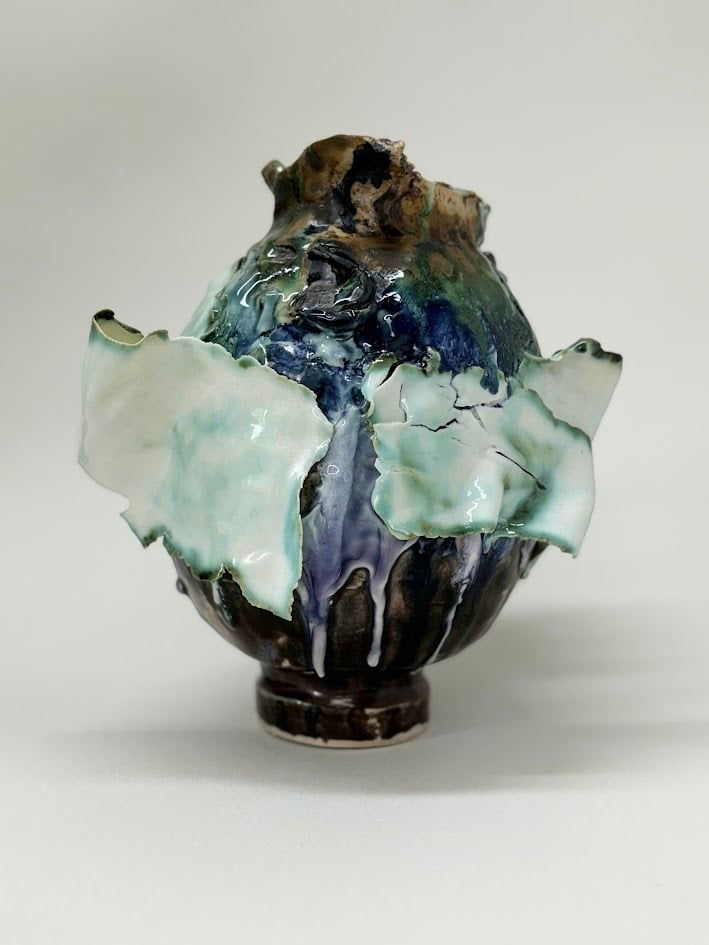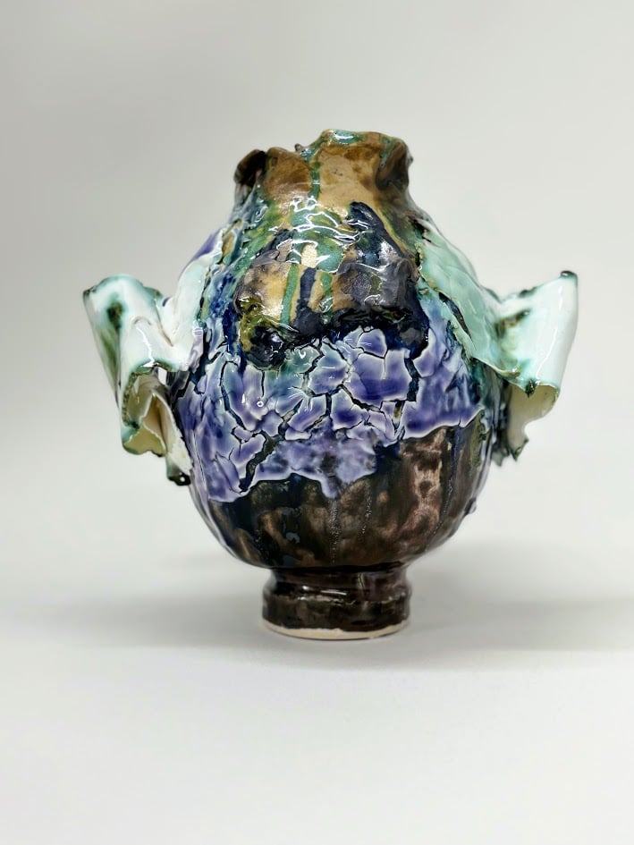 Unique hand built stoneware and porcelain piece. Multiple glazes and firings built up over time.