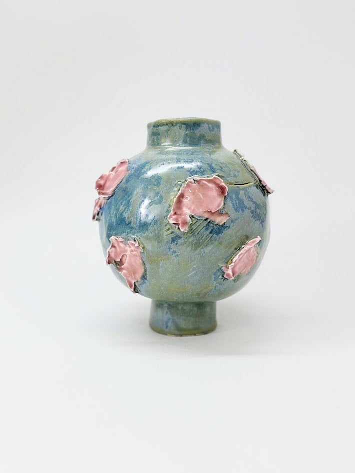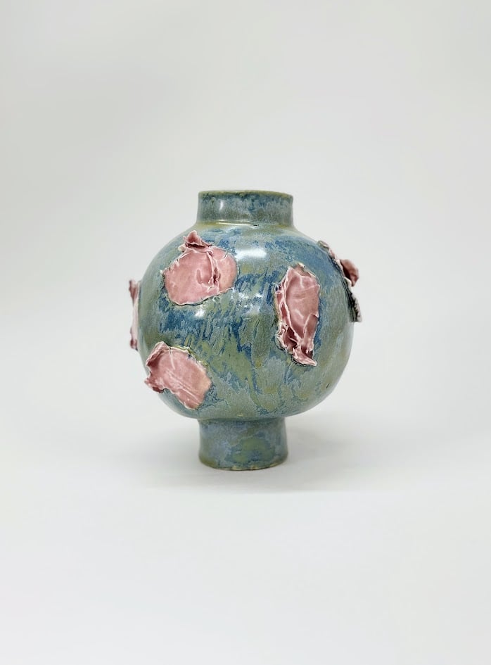 This piece reflects an interest in surfaces that hold traces of disruption and repair. The smooth, rounded form is interrupted by raw, torn patches that sit on the surface like fragments pushing through. These contrasting elements highlight the tension between calmness and rupture, inviting viewers to consider how forms carry their histories—what is hidden beneath and what emerges over time. By combining steady structure with irregular additions, I wanted to explore how beauty can arise from interruption and how objects can feel both whole and in the process of becoming.