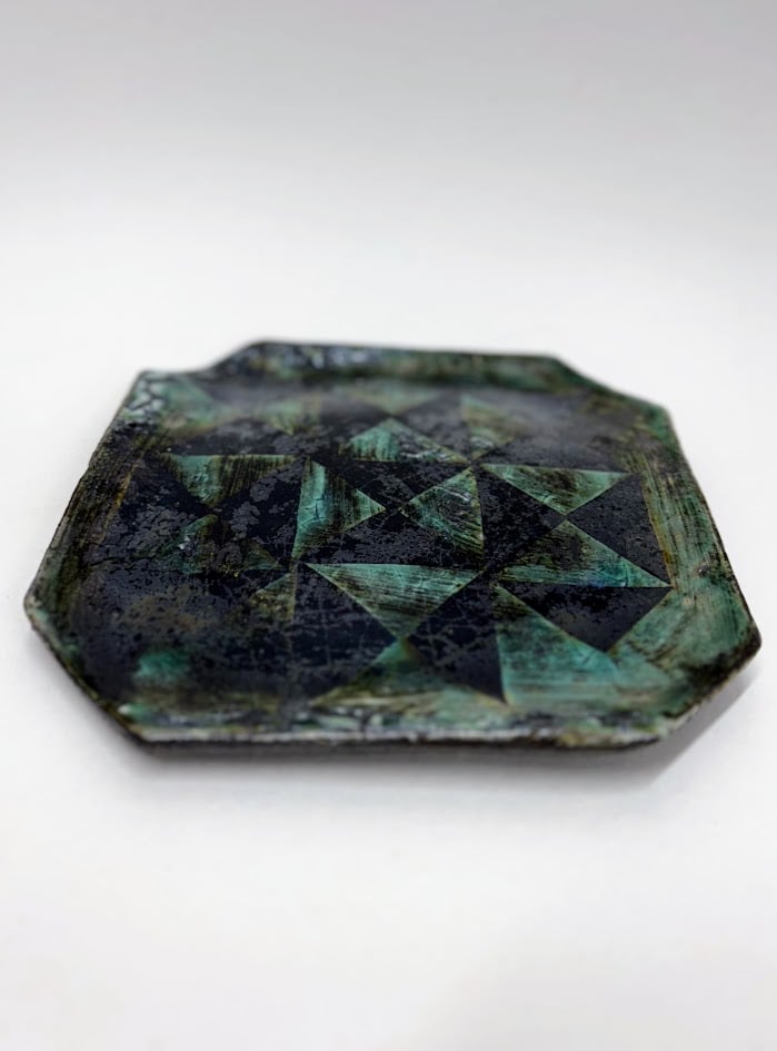 The geometric pattern is softened through glaze and firing, allowing precision to give way to irregularity. Subtle shifts in depth and tone invite the eye to move across the form, where light catches and recedes.