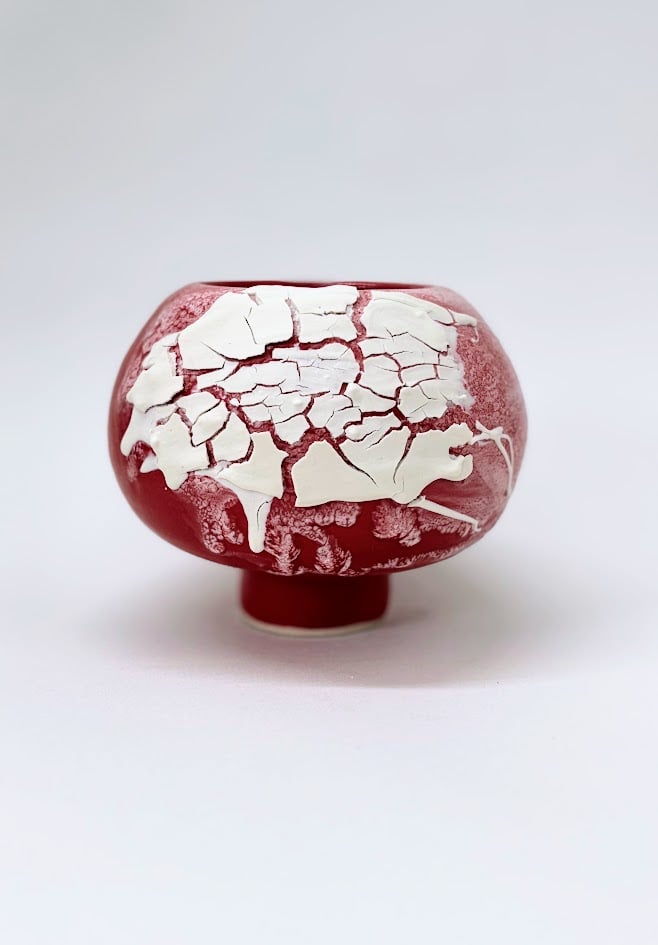 This piece explores the moment when a surface reaches its breaking point. The bold red form is interrupted by a network of white cracking, creating a striking contrast between intensity and fragility. I use this tension to reflect on pressure, rupture, and renewal—how things split open and what those fractures reveal. Rather than hiding the breakage, the work embraces it, suggesting that instability and transformation can become defining parts of a form’s identity.