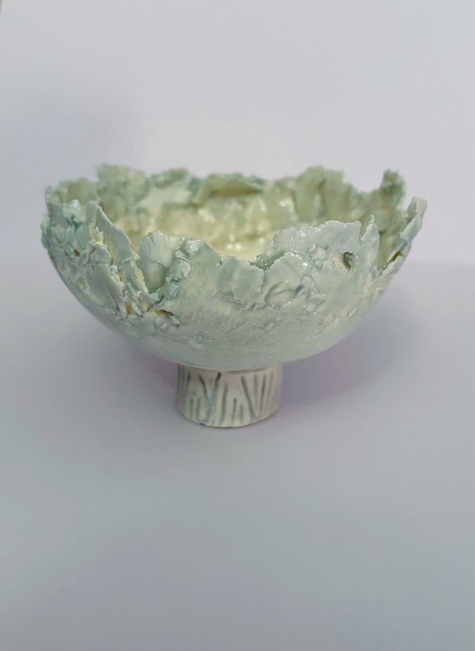 'Fray' explores the beauty found at the edge of unraveling. The fragile, torn rim suggests a form pushed to its limits, where structure begins to break apart yet still holds together. Through this piece, I wanted to reflect on moments of tension and vulnerability—how even as things fray, they can reveal new textures, softness, and a quiet kind of resilience.