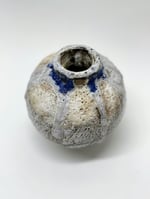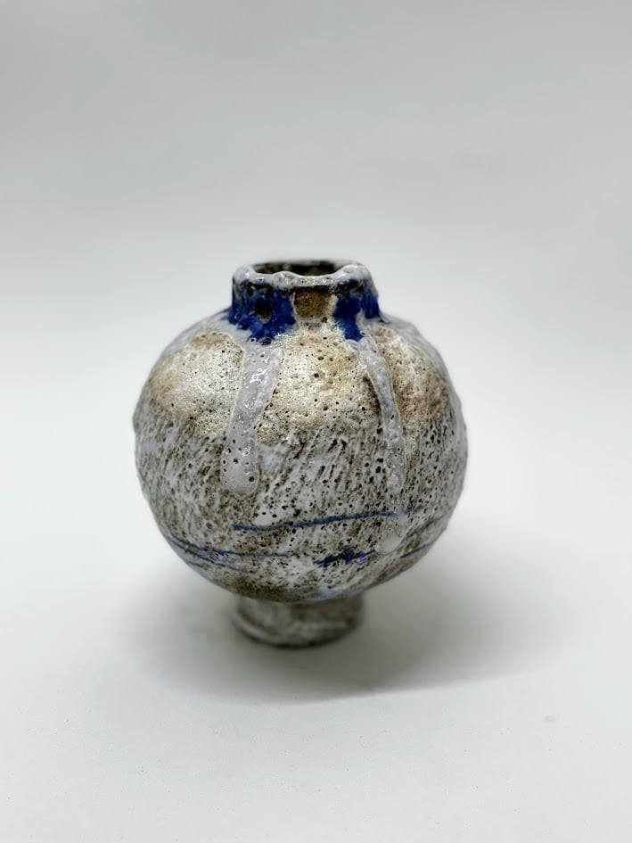 This vessel has a textured, stone-like surface with white and sandy tones. Subtle blue accents and soft glaze drips give it a weathered, almost lunar appearance. Its rounded form and simple foot create a grounded, understated presence.