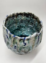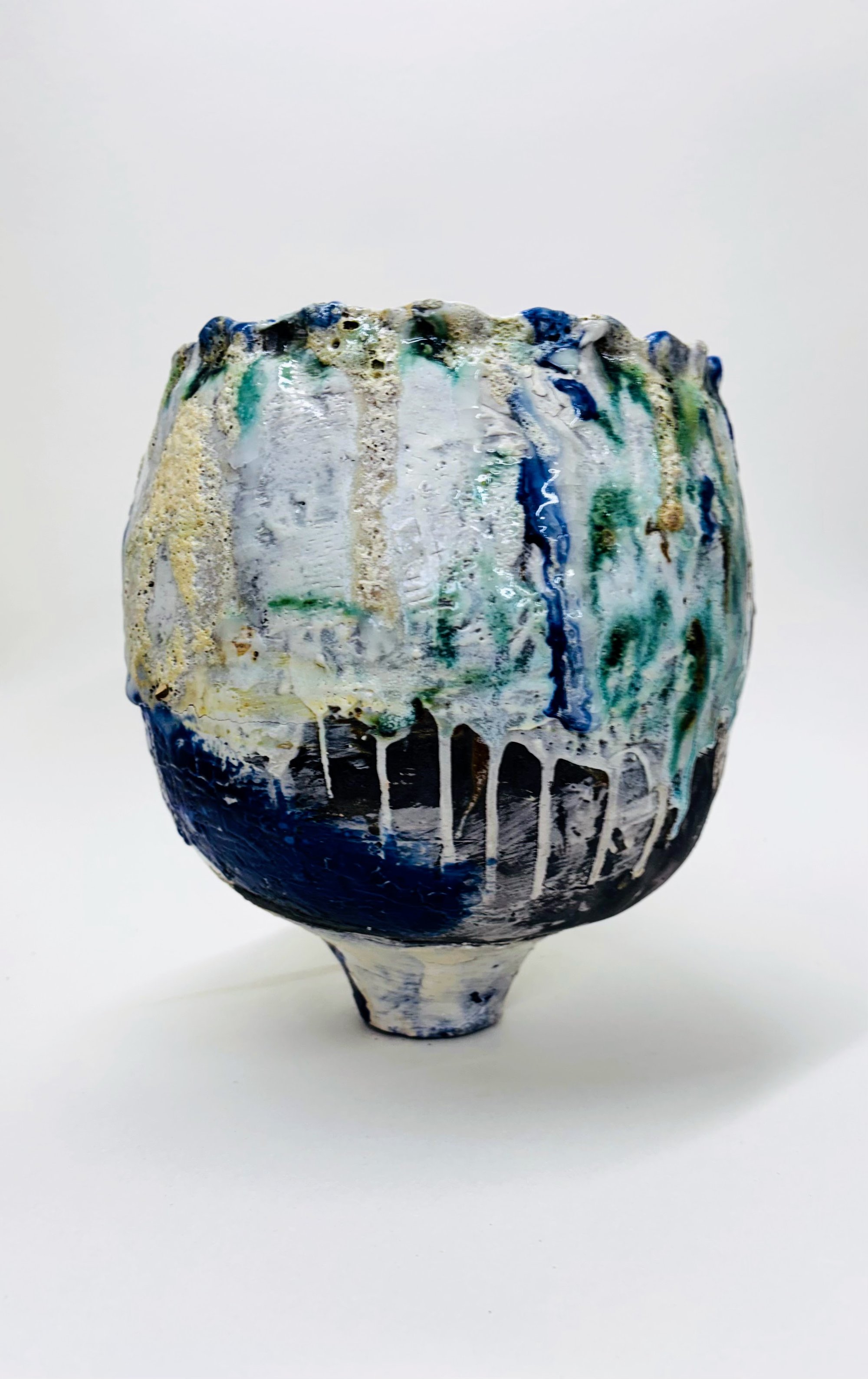 Unique hand built black stoneware vessel, porcelain, glazes, oxides and glass.